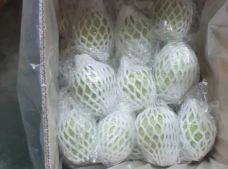 Each guava is individually wrapped in a soft, food-grade foam mesh to prevent surface damage and allow air circulation, ensuring the fruit remains unblemished and fresh.