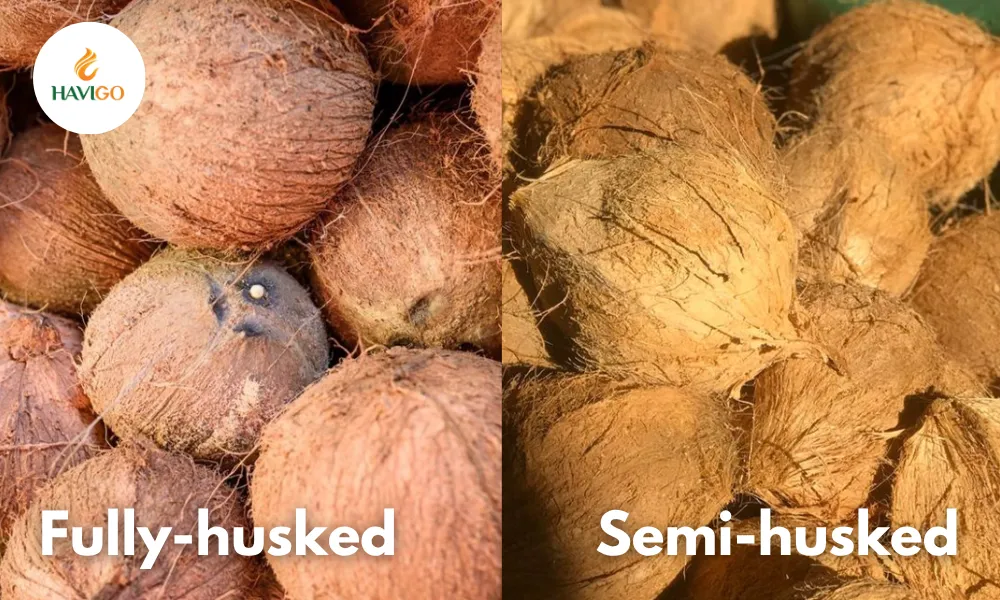 Semi-husked coconuts come from mature coconuts with part of the husk removed, keeping the protective fiber around the “eyes” to extend shelf life and improve durability during long-distance transport. Fully husked coconuts have the entire husk removed, which makes processing easier, but handlers must take extra care because the “eyes” are exposed and freshness can decline faster.